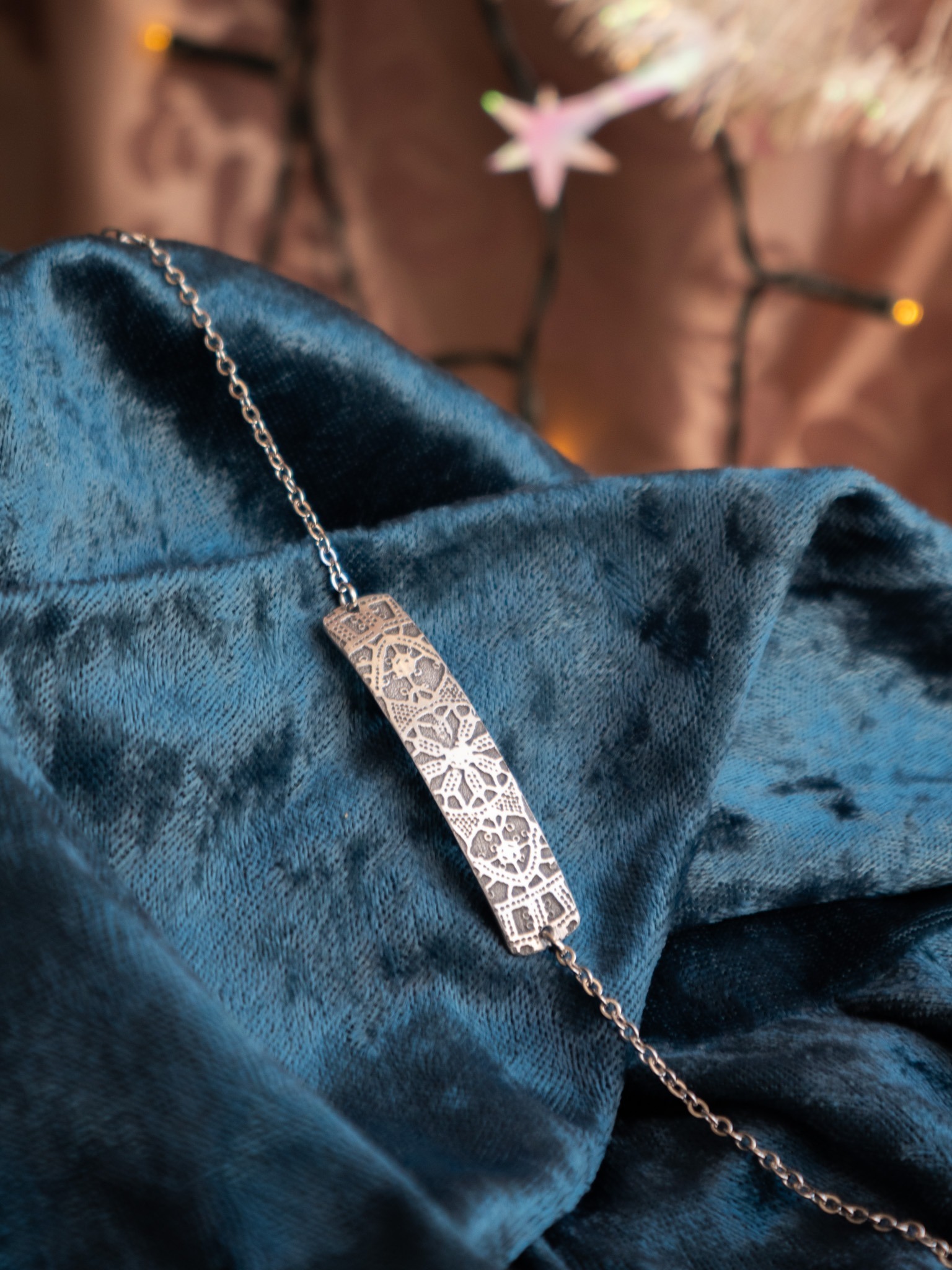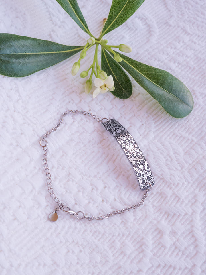Mala narukvica s pločicom koja prikazuje središte okrugle čipke