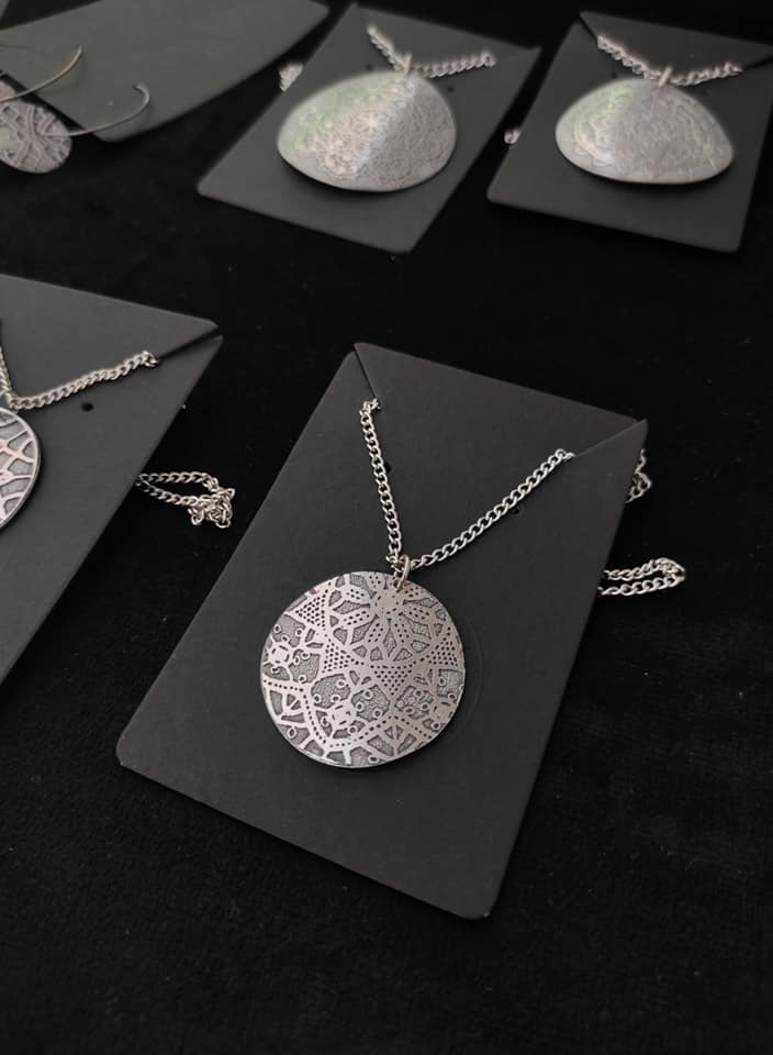 Inspiriran čarolijom Paške čipke, ovaj privjesak je urezan u visokokvalitetni aluminij (99,5%) ekološkom tehnikom pomoću slane vode i struje, što svaki komad čini jedinstvenim. Osnova naušnica izrađena je od medicinskog nehrđajućeg čelika 304, hipoalergenskog i sigurnog za nošenje.